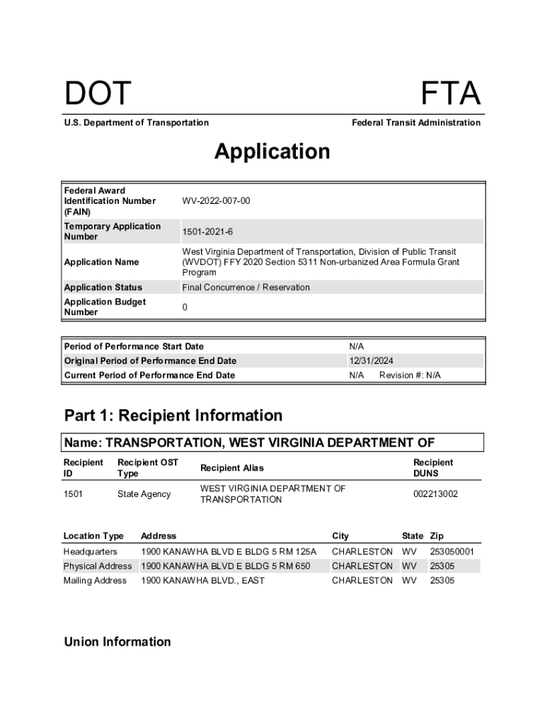 DOTTED. S. Department of Transportation Federal Transit AdministrationApplication Federal Award Identification Number (FAIN)WV202200700Temporary Application Number150120216Application Name West Virginia