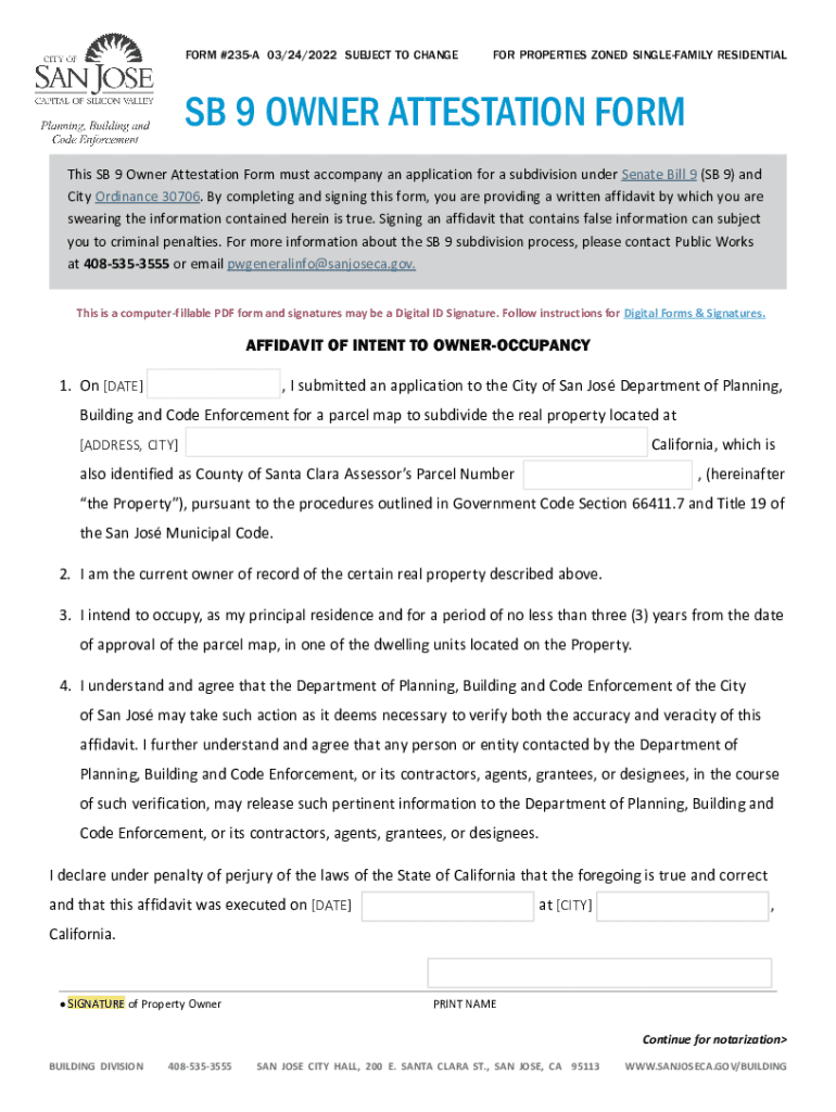 FORM #235A03/24/2022 SUBJECT TO CHANGER PROPERTIES ZONED SINGLEFAMILY RESIDENTIAL SB 9 OWNER ATTESTATION FORM This SB 9 Owner Attestation Form must accompany an application for a subdivision under