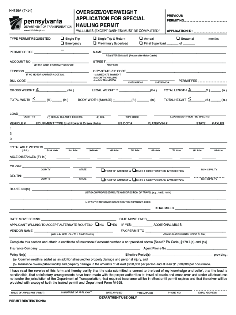 M936A (714)www.dot.state.pa.usTYPE PERMIT REQUESTED: OVERSIZE/OVERWEIGHT APPLICATION FOR SPECIAL HAULING PERMITPREVIOUS PERMIT NO.:\'\'ALL LINES (EXCEPT DASHES) MUST BE COMPLETED\” APPLICATION ID: