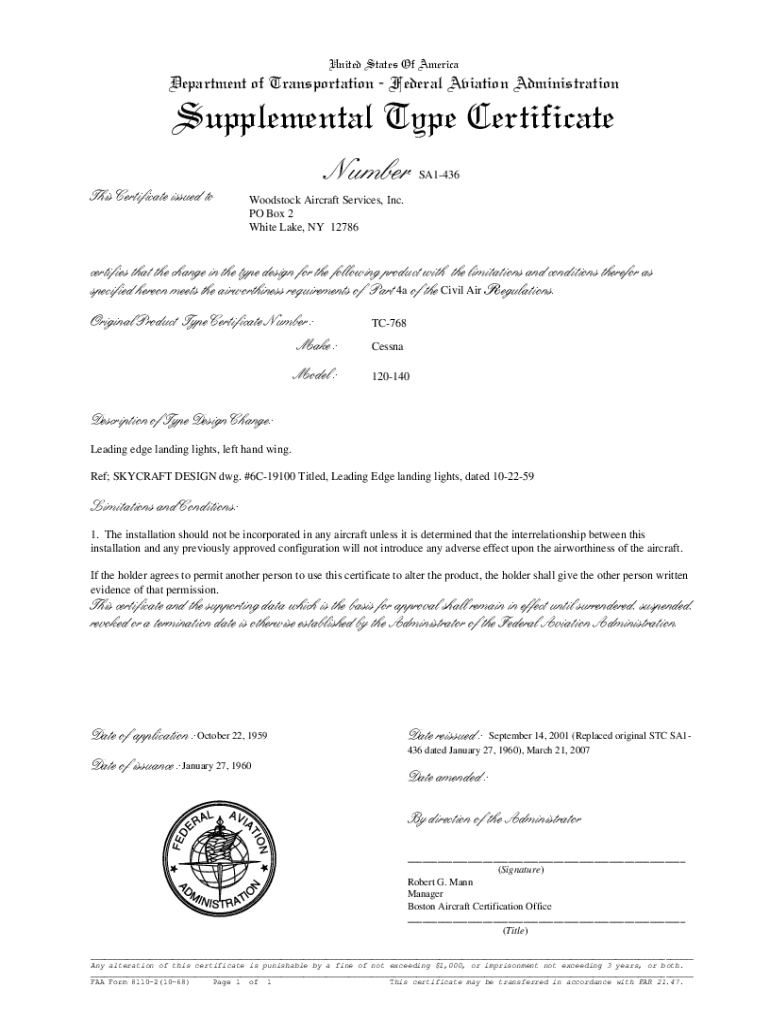 United States Of AmericaDepartment of Transportation Federal Aviation AdministrationSupplemental Type Certificate