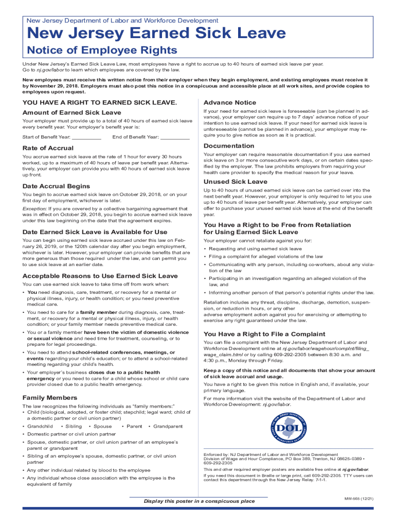 New Jersey Department of Labor and Workforce Development Jersey Earned Sick Leave Notice of Employee Right-hander New Jerseys Earned Sick Leave Law, most employees have a right to accrue up to 40