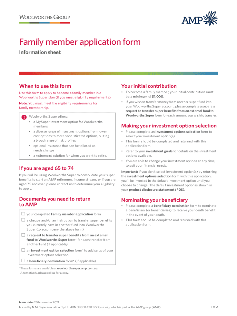 Family member application form Information heathen to use this former initial contributions this form to apply to become a family member in a Woolworths Super plan (if you meet eligibility requirements).