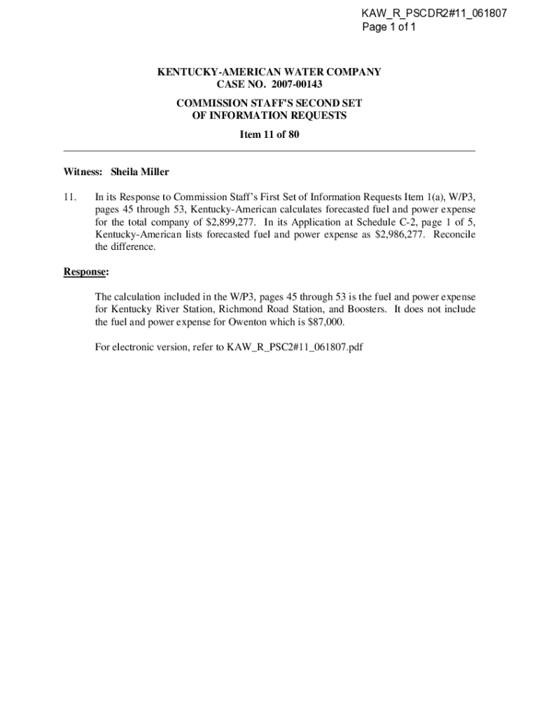KAW_R_PSCDR2#11_061807-Page 1 of 1KENTUCKYAMERICAN WATER COMPANY CASE NO. 200700143 COMMISSION STAFF\'S SECOND SET OF INFORMATION REQUESTS Item 11 of 80 ___ Witness: Sheila Miller 11. In its Response