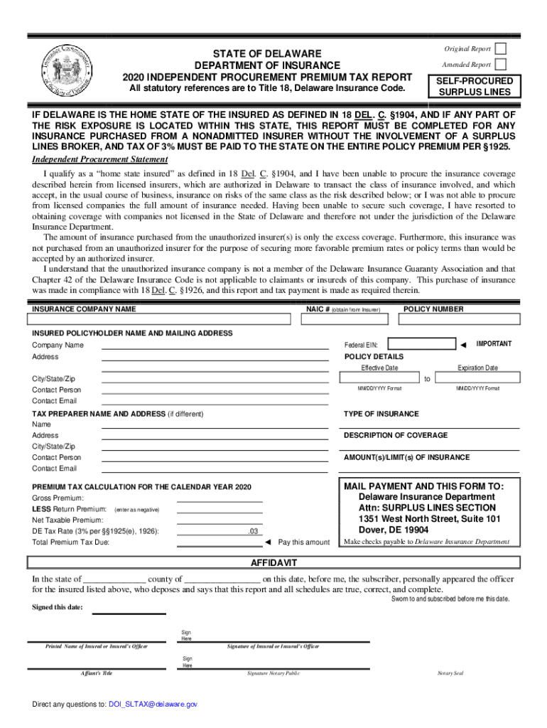 Original Reportage OF DELAWARE DEPARTMENT OF INSURANCE 2020 INDEPENDENT PROCUREMENT PREMIUM TAX REPORTAmended ReportSELFPROCURED SURPLUS Lineal statutory references are to Title 18, Delaware Insurance