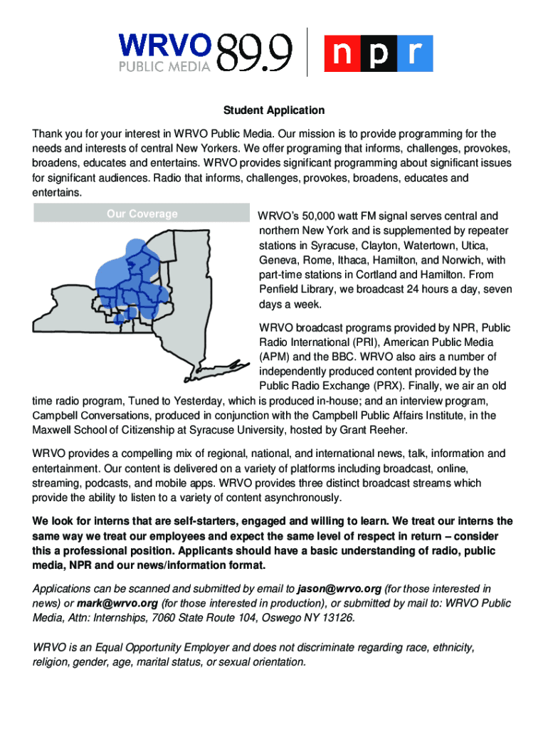 Get the free Student Application Our Coverage WRVOs 50,000 watt FM signal s