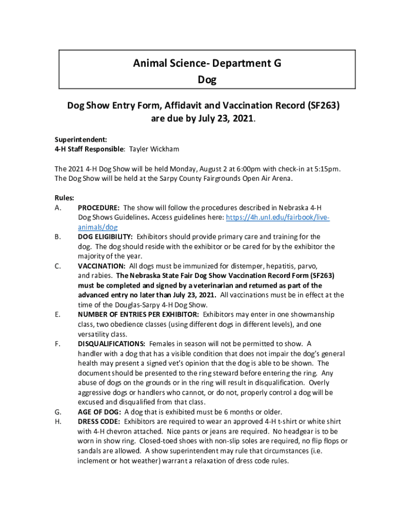 Animal Science Department G Dog Show Entry Form, Affidavit and Vaccination Record (SF263) are due by July 23, 2021. Superintendent: 4H Staff Responsible: Taylor Wickham The 2021 4H Dog Show will be