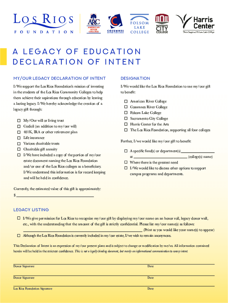 A legacy of education declaration of intent My/Our Legacy Declaration of IntentDesignationI/We support the Los Rios Foundations mission of investing in the students of the Los Rios Community Colleges