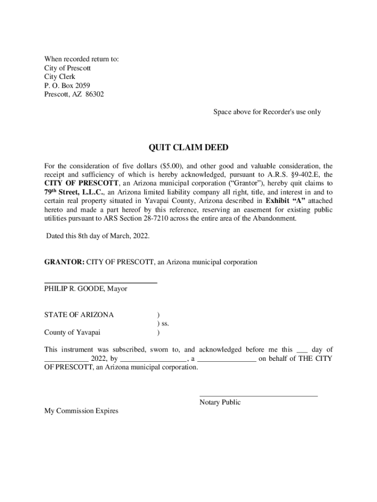 When recorded return to: City of Prescott City Clerk P. O. Box 2059 Prescott, AZ 86302 Space above for Recorder\'s use obliquity CLAIM DEED For the consideration of five dollars ($5.00), and other