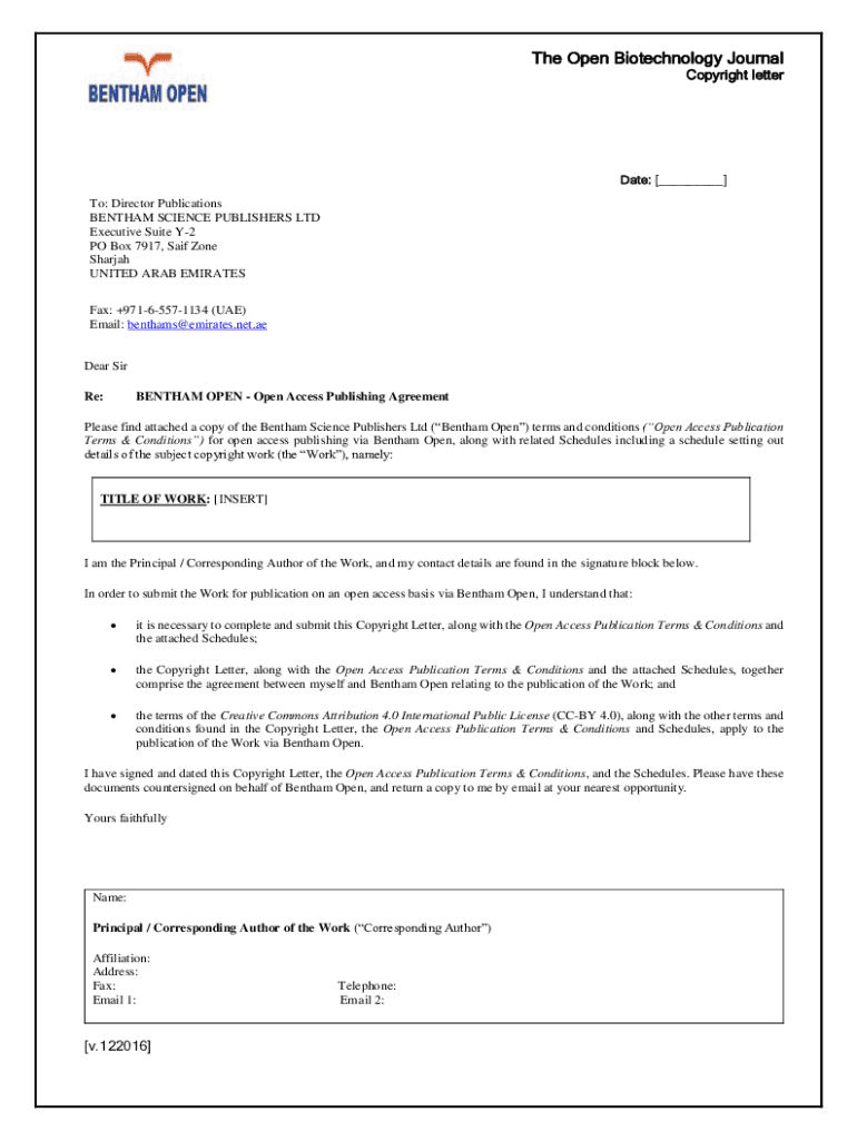 The Open Biotechnology Journal Copyright littermate: [___] To: Director Publications BENTHAM SCIENCE PUBLISHERS LTD Executive Suite Y2 PO Box 7917, Saiph Zone Shariah UNITED ARAB EMIRATES Fax: +97165571134