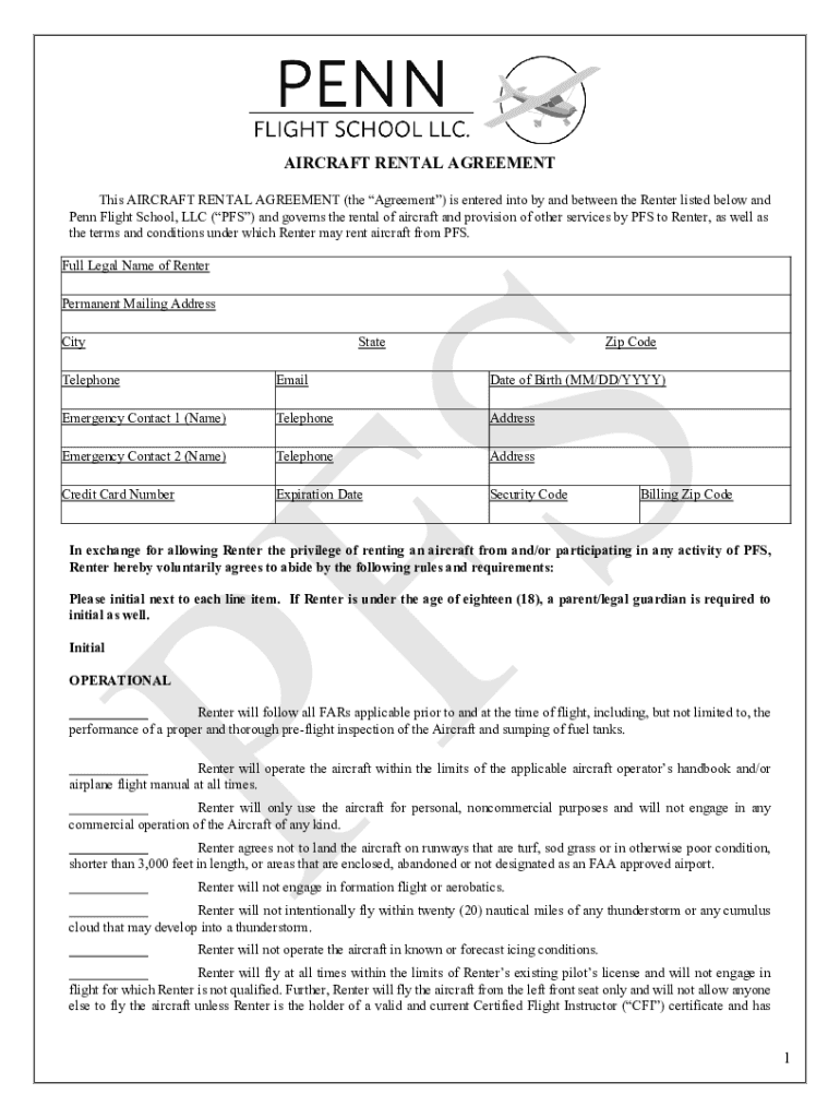 AIRCRAFT RENTAL AGREEMENT This AIRCRAFT RENTAL AGREEMENT (the Agreement) is entered into by and between the Renter listed below and Penn Flight School, LLC (PFS) and governs the rental of aircraft
