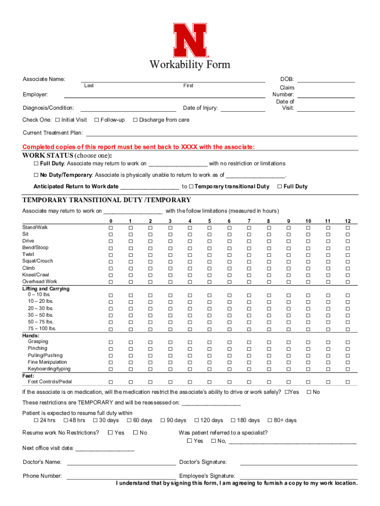 Workability Form Associate Name:Last DOB:Disclaim Number: Date of Visit:Employer: Diagnosis/Condition: Check One: Initial Initiate of Injury: Followup Discharge from recurrent Treatment Plan:Completed
