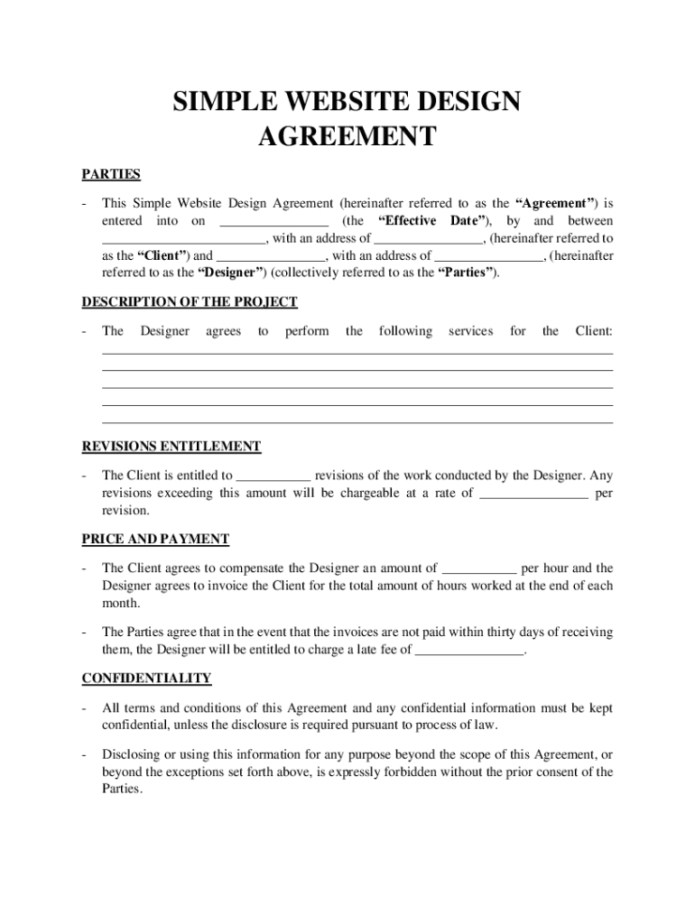 SIMPLE WEBSITE DESIGN AGREEMENT PARTIES This Simple Website Design Agreement (hereinafter referred to as the Agreement) is entered into on ___ (the Effective Date), by and between ___, with an address