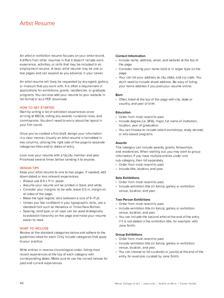 Artist Resumed artist or exhibition resume focuses on your artist record. It differs from other resumes in that it doesn't include work experience, activities, or skills that may be included in an