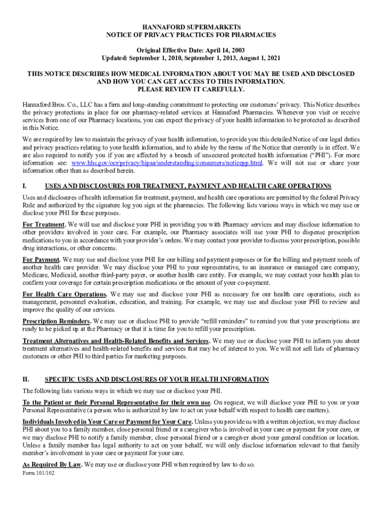 HANFORD SUPERMARKETS NOTICE OF PRIVACY PRACTICES FOR PHARMACIES Original Effective Date: April 14, 2003, Updated: September 1, 2010, September 1, 2013, August 1, 2021, THIS NOTICE DESCRIBES HOW MEDICAL