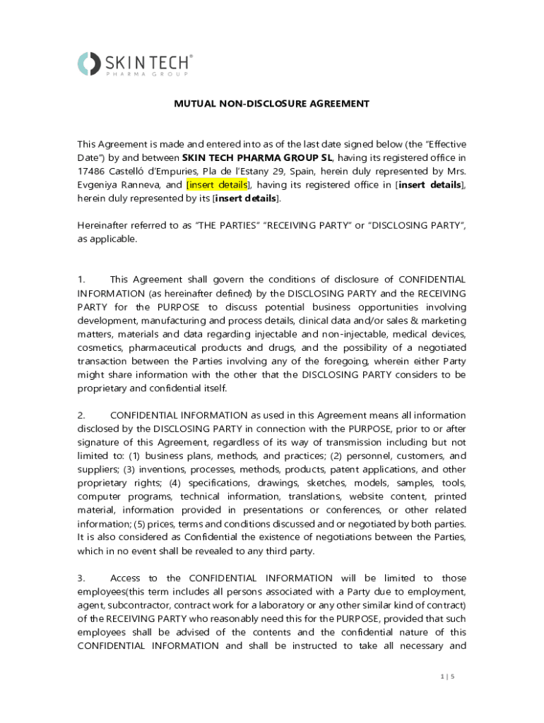 MUTUAL NONDISCLOSURE Agreements Agreement is made and entered into as of the last date signed below (the Effective Date) by and between SKIN TECH PHARMA GROUP SL, having its registered office in 17486