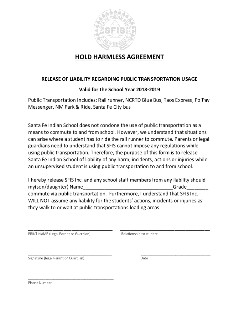 HOLD HARMLESS AGREEMENT RELEASE OF LIABILITY REGARDING PUBLIC TRANSPORTATION USAGE Valid for the School Year 20182019 Public Transportation Includes: Rail runner, NC RTD Blue Bus, Tao's Express, Poppy