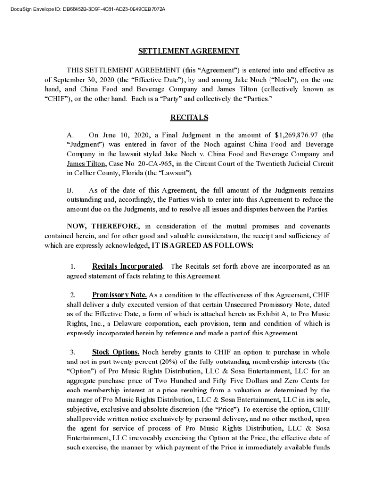 DocuSign Envelope ID: DB68452B3D9F4C81AD230E49CEB7072ASETTLEMENT AGREEMENT THIS SETTLEMENT AGREEMENT (this Agreement) is entered into and effective as of September 30, 2020 (the Effective Date), by