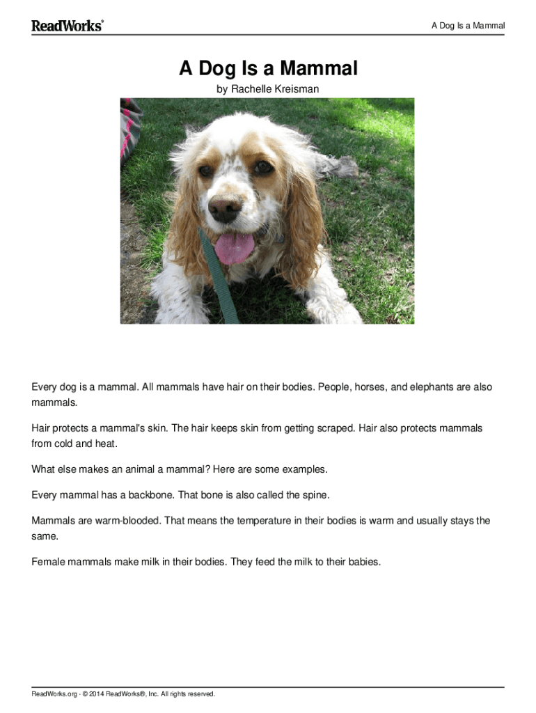 A Dog Is a Mammals Dog Is a Mammal by Rachelle KreismanEvery dog is a mammal. All mammals have hair on their bodies. People, horses, and elephants are also mammals. Hair protects a mammal\'s skin.