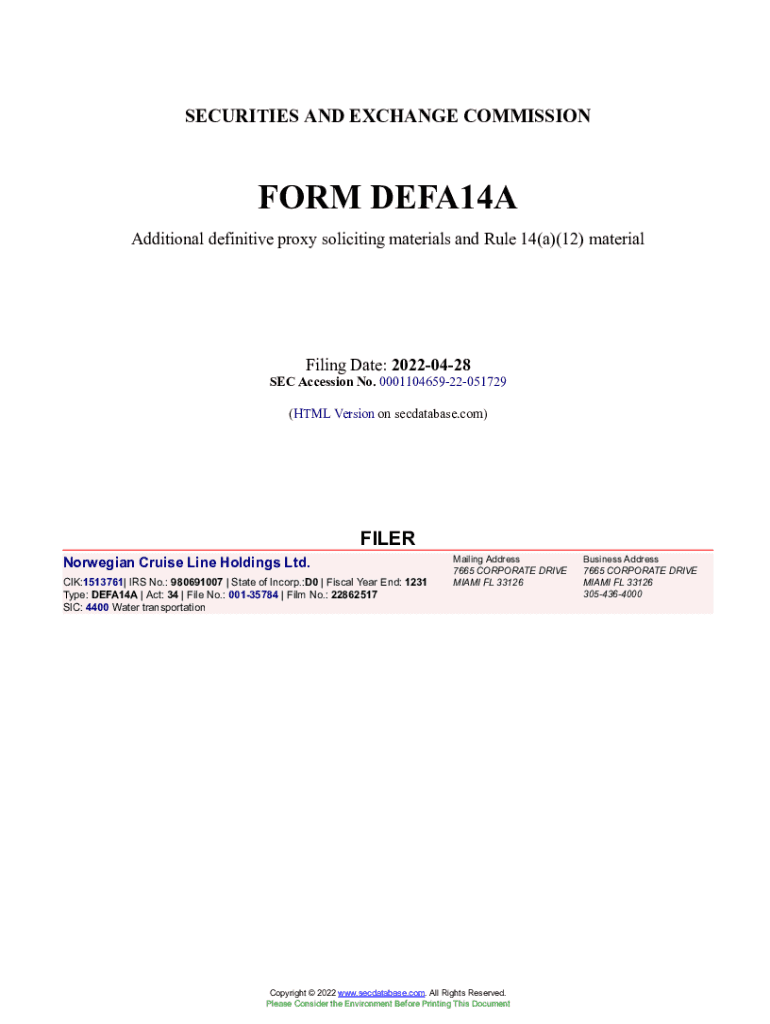 Get the free Norwegian Cruise Line Holdings Ltd. Form DEFA14A Filed 2022-04-28. Accession Number