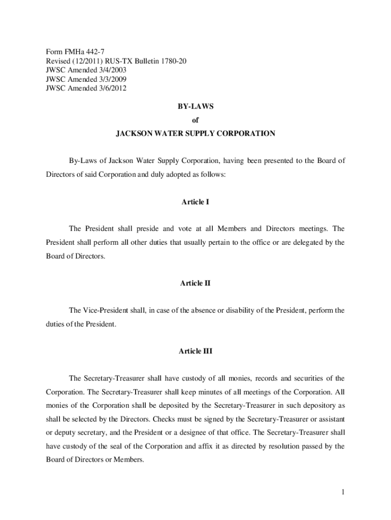 Form FHA 4427 Revised (12/2011) RUST Bulletin 178020 JWS Amended 3/4/2003 JWS Amended 3/3/2009 JWS Amended 3/6/2012 BYLAWS of JACKSON WATER SUPPLY CORPORATIONByLaws of Jackson Water Supply Corporation,