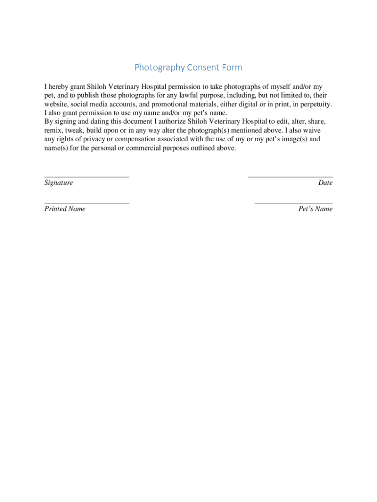 Photography Consent Form I hereby grant Shiloh Veterinary Hospital permission to take photographs of myself and/or my pet, and to publish those photographs for any lawful purpose, including, but not
