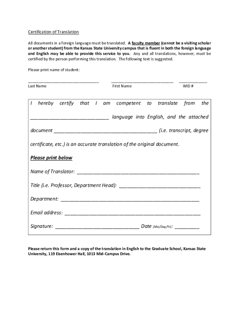 Certification of Translation All documents in a foreign language must be translated. A faculty member (cannot be a visiting scholar or another student) from the Kansas State University campus that