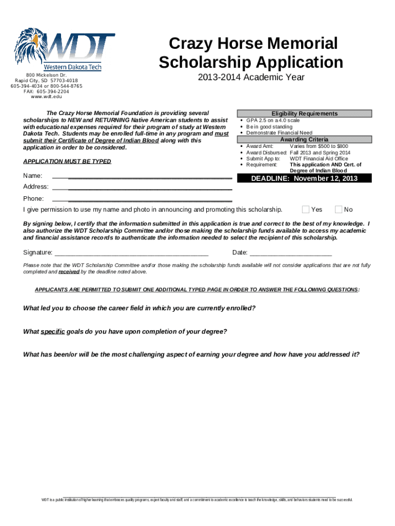 Instructions for the www.wdt.edupaying-for-schoolscholarshipsWestern Dakota TechCrazy Horse Memorial Opportunities - WDT form