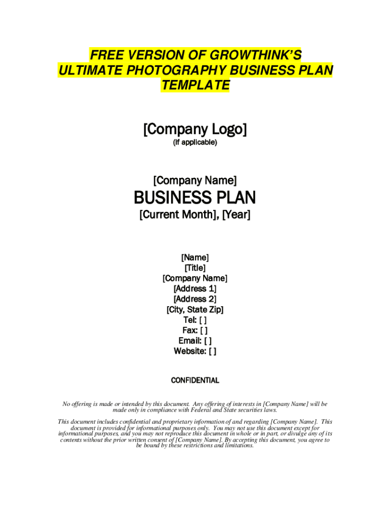 FREE VERSION OF GROWTHS ULTIMATE PHOTOGRAPHY BUSINESS PLAN TEMPLATE[Company Logo] (if applicable)[Company Name]BUSINESS PLAN [Current Month], [Year][Name] [Title] [Company Name] [Address 1] [Address