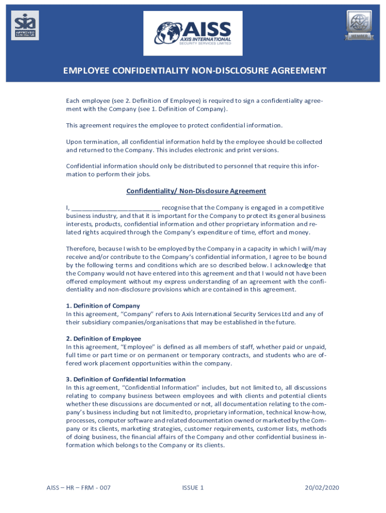 EMPLOYEE CONFIDENTIALITY NONDISCLOSURE AGREEMENTPersonal Assessment Form:Each employee (see 2. Definition of Employee) is required to sign a confidentiality agreement with the Company (see 1. Definition