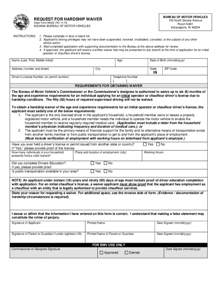 Reset FormBUREAU OF MOTOR VEHICLES 100 North Senate Avenue Room N481 Indianapolis, IN 46204REQUEST FOR HARDSHIP WAIVER State Form 28622 (R5 / 513)INDIANA BUREAU OF MOTOR VEHICLES INSTRUCTIONS:1. Please