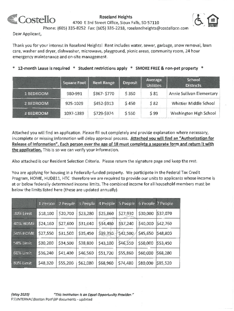 Roseland Heights 4700 E 3rd Street Office, Sioux Falls, SD 57110 Phone: (605) 3358252 Fax: (605) 3352218, roselandheights@costelloco.comEatuu. Total Opportunities Applicant, Thank you for your interest