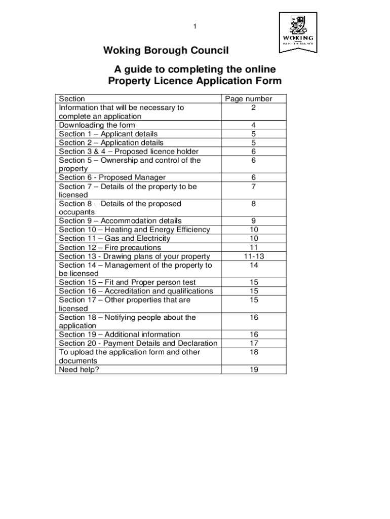1Woking Borough Council A guide to completing the online Property License Application Form Section Page number Information that will be necessary to 2 complete an application Downloading the form