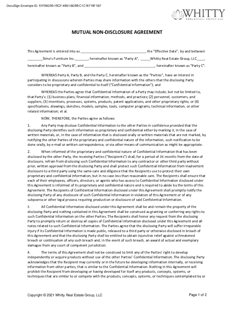 DocuSign Envelope ID: 61F64D9618CF4841BD88C1C74718F1B7MUTUAL NONDISCLOSURE Agreements Agreement is entered into as ___, the Effective Date, by and between ___Simon Furniture Inc.___, hereinafter known