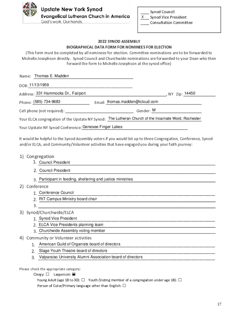 Get the free Nominating Committee Report. THE THIRTY-THIRD ASSEMBLY OF THE UPSTATE NEW YORK SYNOD...