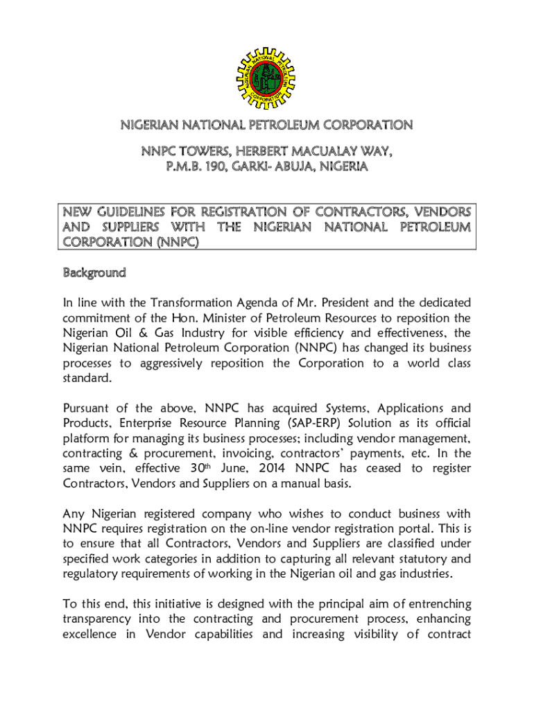NIGERIAN NATIONAL PETROLEUM CORPORATION NPC TOWERS, HERBERT MANUALLY WAY, P.M.B. 190, PARK ABUJA, NIGERIA NEW GUIDELINES FOR REGISTRATION OF CONTRACTORS, VENDORS AND SUPPLIERS WITH THE NIGERIAN NATIONAL