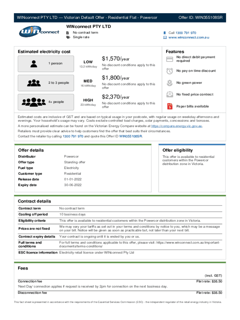 WIN connect PTY LTD Victorian Default Offer Residential Flat PowercorOffer ID: WIN355108SRWINconnect PTY LTD No contract term Single recall 1300 791 970 www.winconnect.com.auEstimated electricity
