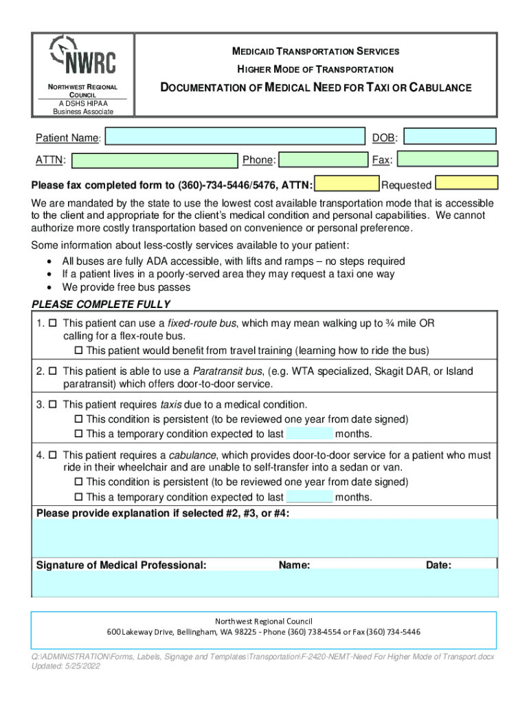 MEDICAID TRANSPORTATION SERVICES HIGHER MODE OF TRANSPORTATION NORTHWEST REGIONAL COUNCIL A DSS HIPAA Business AssociateDOCUMENTATION OF MEDICAL NEED FOR TAXI OR CABULANCEPatient Name:DOB:ATTN:Phone:Fax:Please
