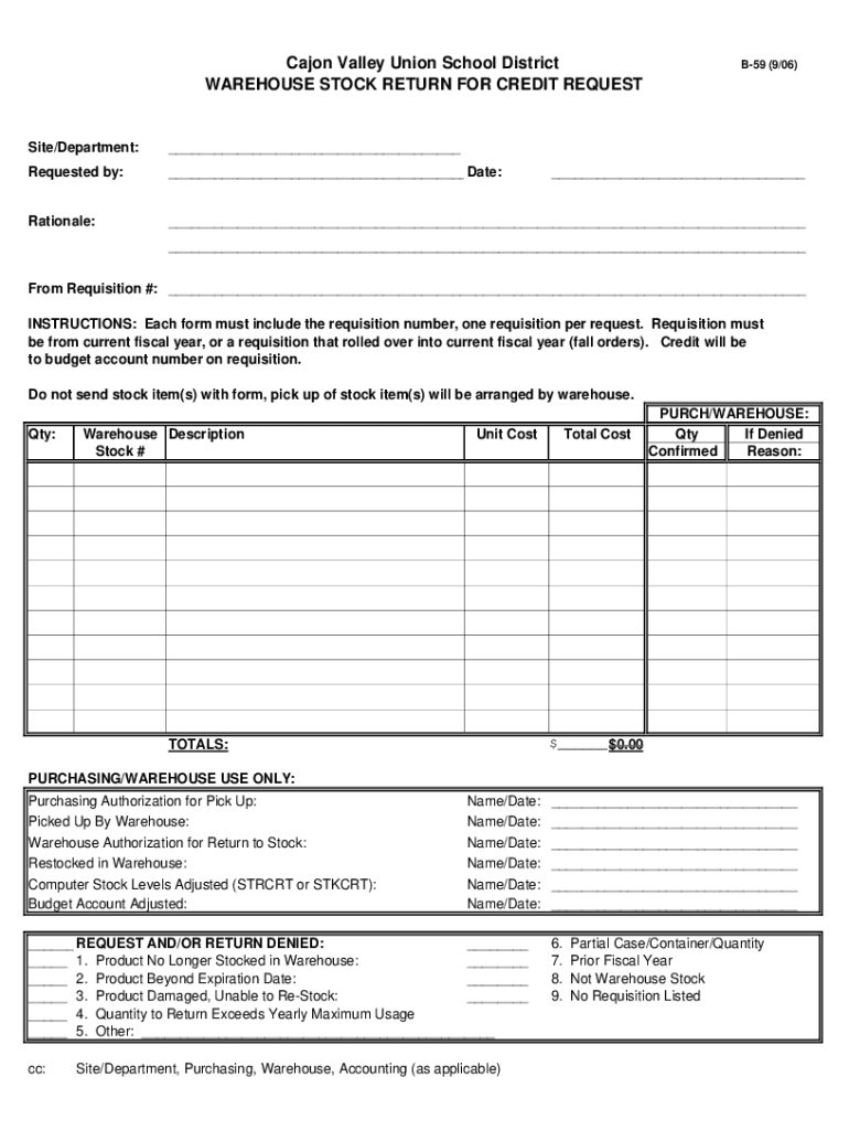 Get the free Cajon Valley Union School District B-59 (9/06) WAREHOUSE STOCK RETURN ...