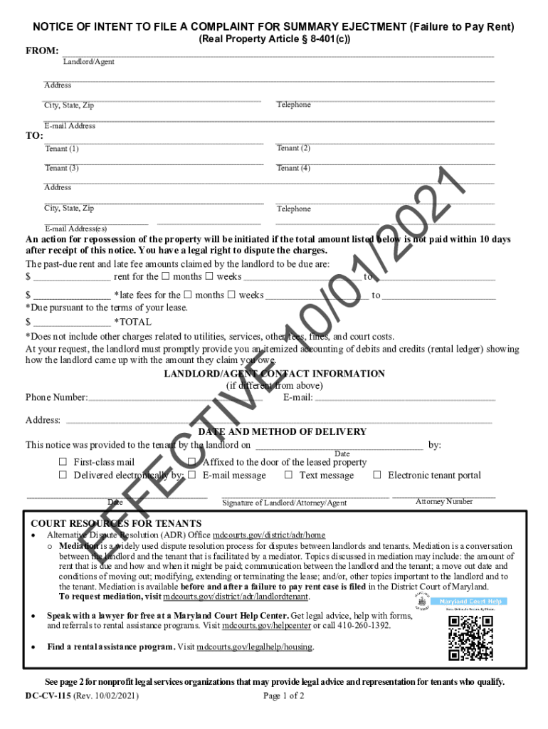 NOTICE OF INTENT TO FILE A COMPLAINT FOR SUMMARY ENACTMENT (Failure to Pay Rent) (Real Property Article 8401(c)) FROM: Landlord/Agent Address TelephoneCity, State, Zip TO:Email Address Tenant (1)Tenant