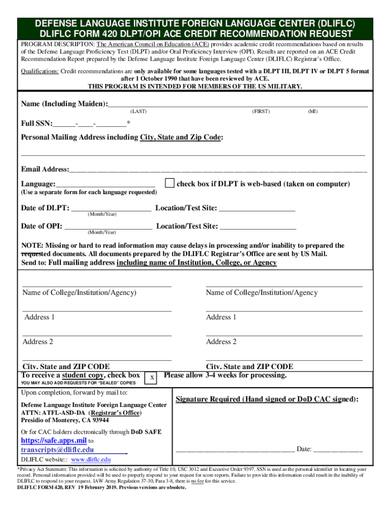 DEFENSE LANGUAGE INSTITUTE FOREIGN LANGUAGE CENTER (LFLC) LFLC FORM 420 DPT/OPI ACE CREDIT RECOMMENDATION REQUEST PROGRAM DESCRIPTION: The American Council on Education (ACE) provides academic credit