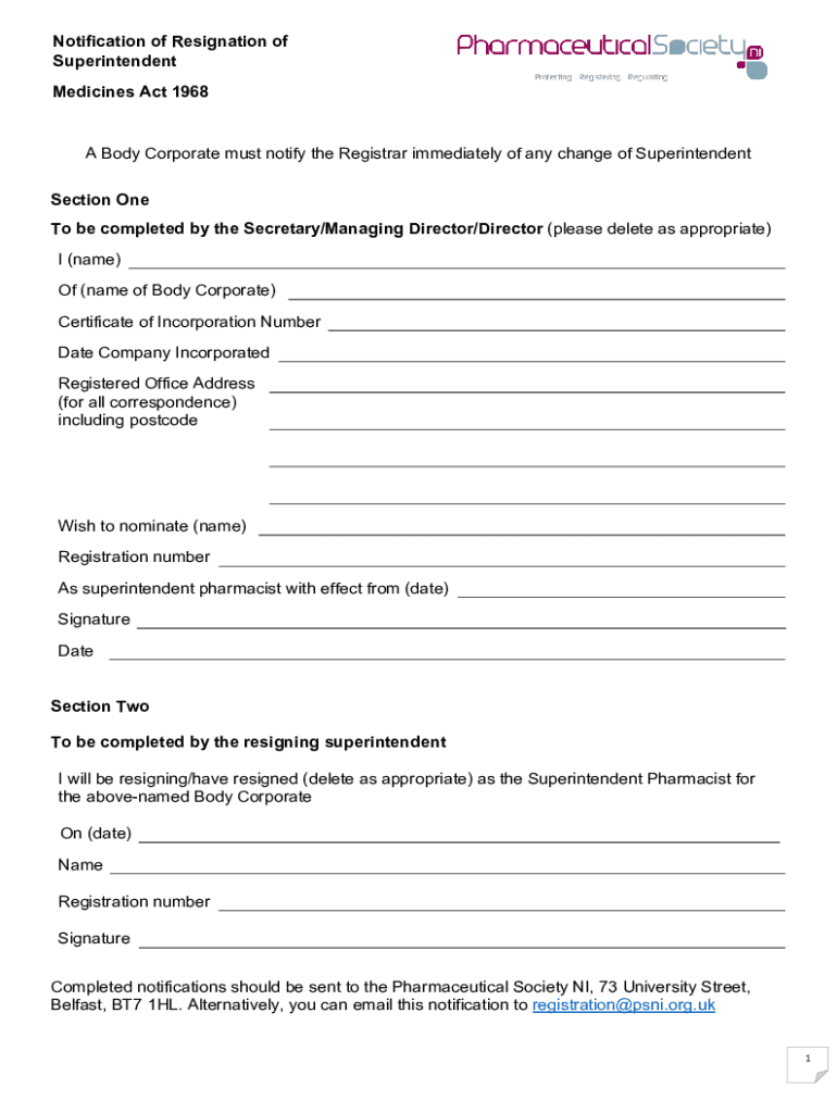 Notification of Resignation of Superintendent Medicines Act 1968 A Body Corporate must notify the Registrar immediately of any change of Superintendent Section One To be completed by the Secretary/Managing