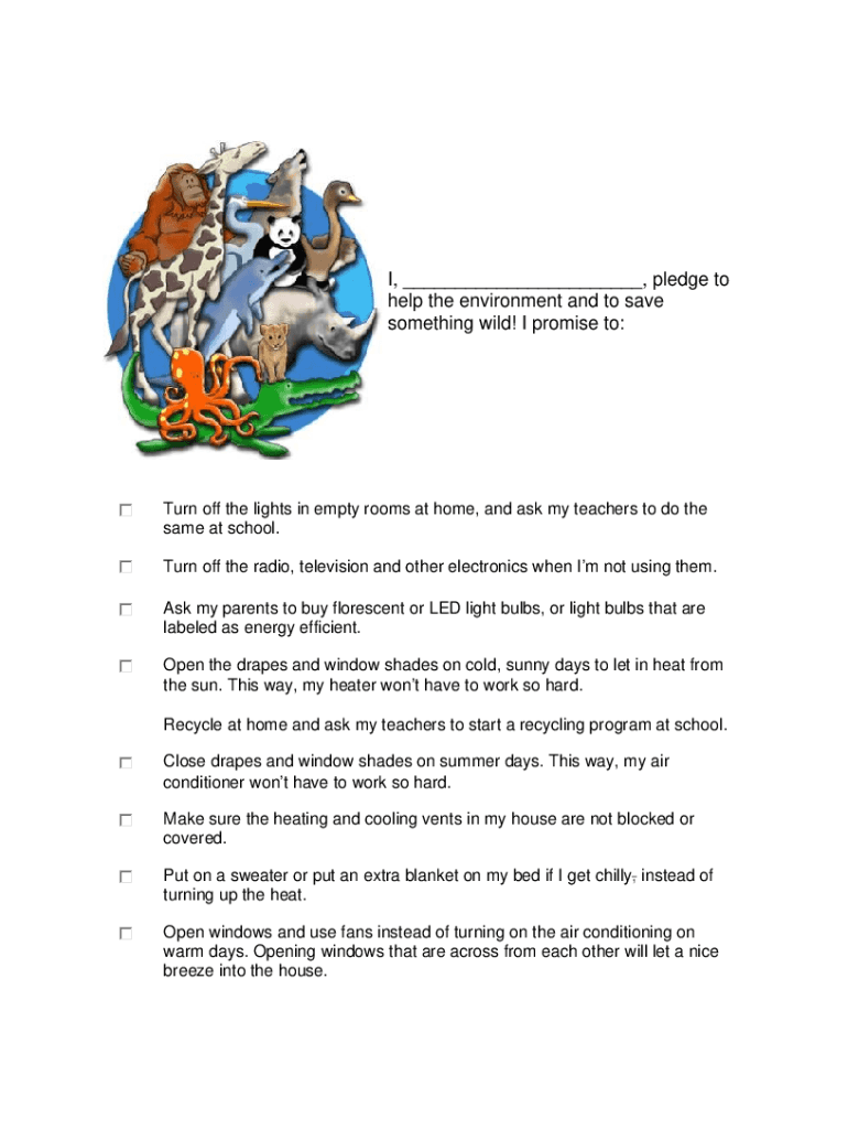 I, ___, pledge to help the environment and to save something wild! I promise to:Turn off the lights in empty rooms at home, and ask my teachers to do the same at school. Turn off the radio, television