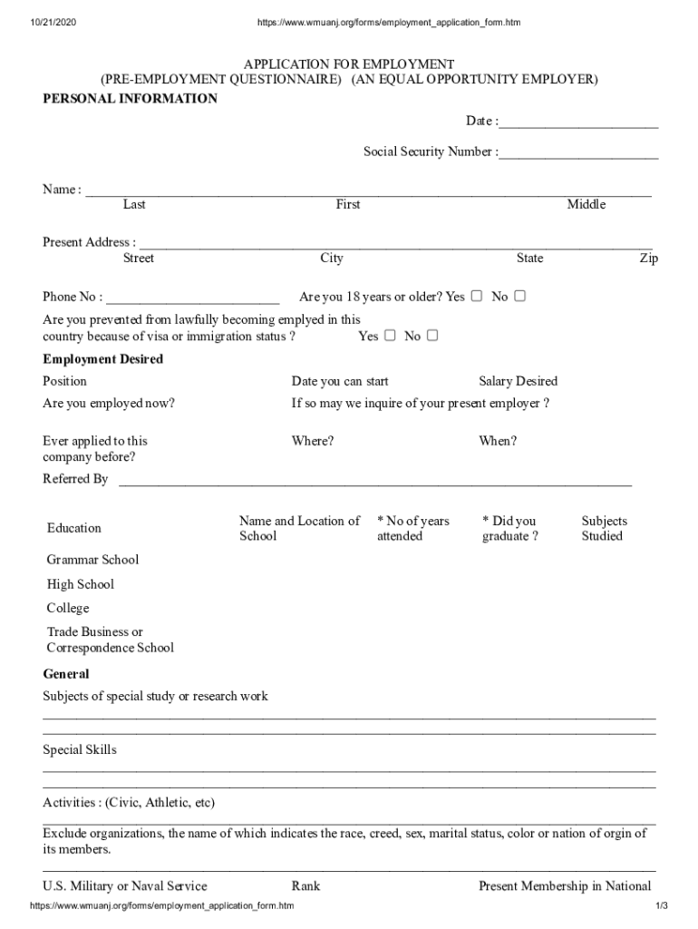 10/21/2020https://www.wmuanj.org/forms/employment_application_form.htmAPPLICATION FOR EMPLOYMENT (PREEMPLOYMENT QUESTIONNAIRE) (AN EQUAL OPPORTUNITY EMPLOYER) PERSONAL INFORMATION Date :___ Social