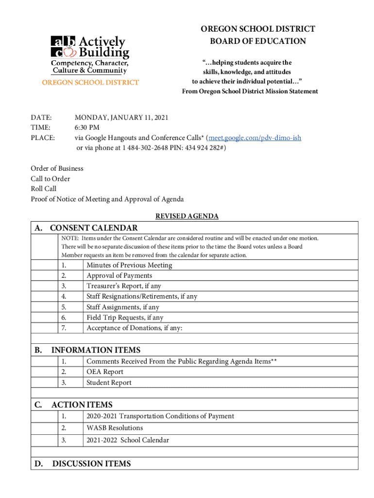 OREGON SCHOOL DISTRICT BOARD OF EDUCATION helping students acquire the skills, knowledge, and attitudes to achieve their individual potential From Oregon School District Mission StatementDATE: TIME: