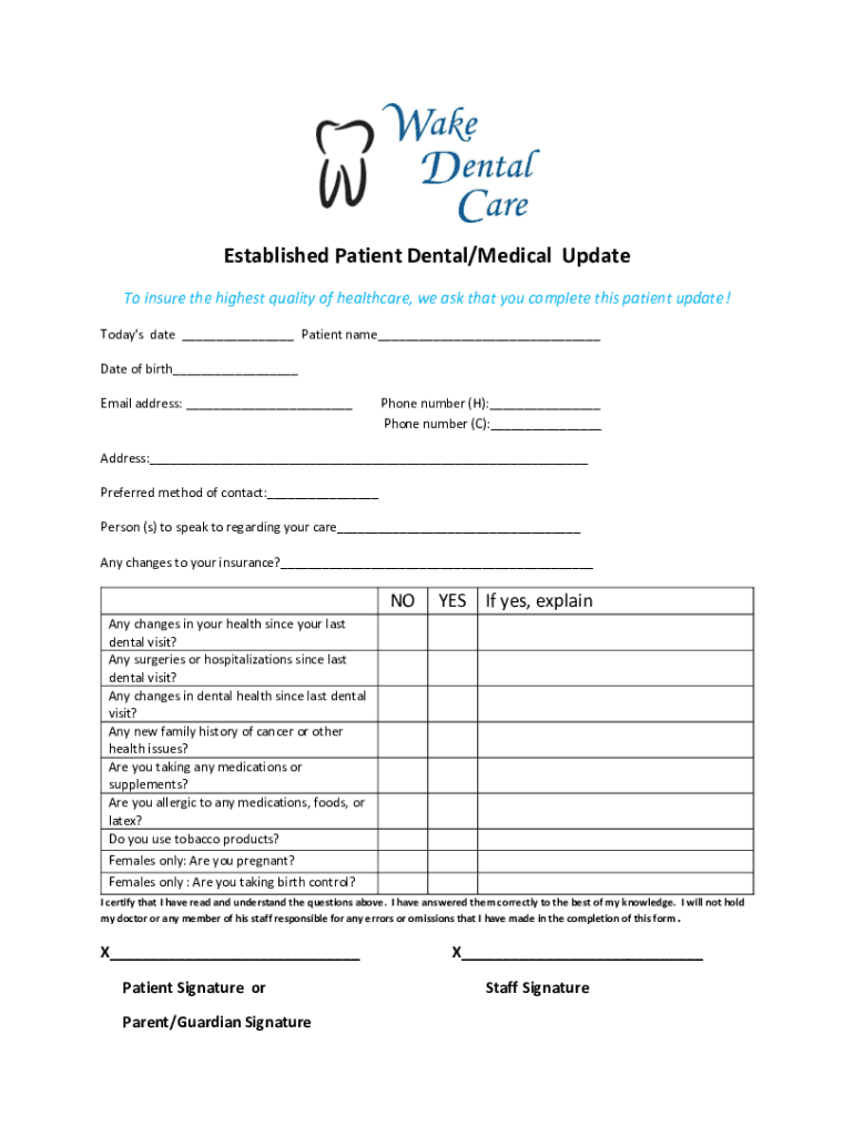 Established Patient Dental/Medical Update To insure the highest quality of healthcare, we ask that you complete this patient update! Today\'s date ___ Patient name___ Date of birth___ Email address: