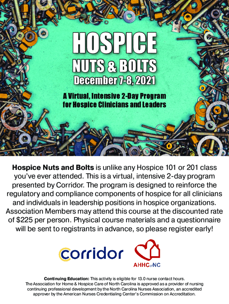 HOSPICE NUTS & BOLTS December 78, 2021A Virtual, Intensive 2Day Program for Hospice Clinicians and LeadersHospice Nuts and Bolts is unlike any Hospice 101 or 201 class you've ever attended. This is