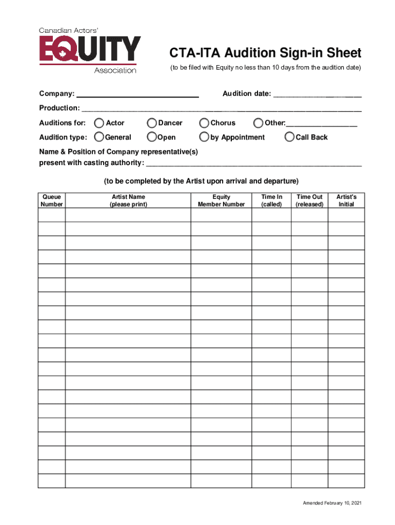Clear FormCTAITA Audition Signing Sheet (to be filed with Equity no less than 10 days from the audition date)Company:Audition date: ___Production: ___ Auditions for:ActorDancerChorusOther:___Audition