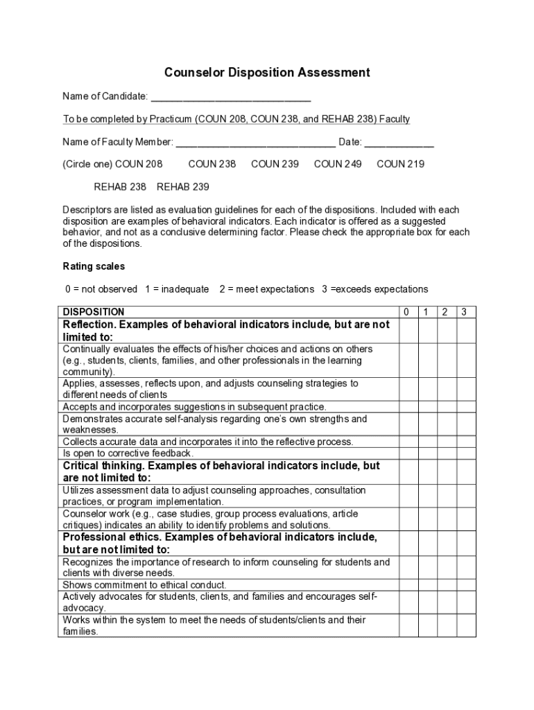 Counselor Disposition Assessment Name of Candidate: ___ To be completed by Practicum (COIN 208, COIN 238, and REHAB 238) Faculty Name of Faculty Member: ___ Date: ___ (Circle one) COIN 208 REHAB 238COUN