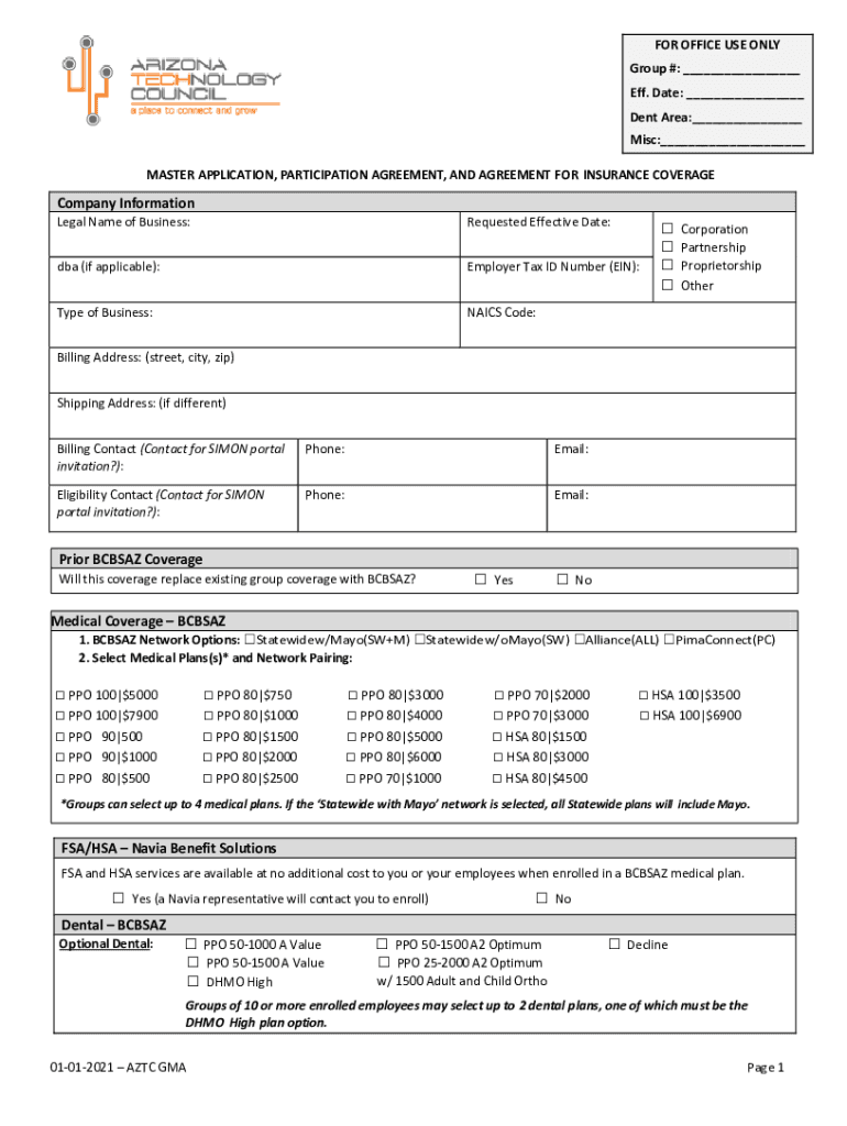 FOR OFFICE USE ONLY Group #: ___ Eff. Date: ___ Dent Area:___ Misc:___ MASTER APPLICATION, PARTICIPATION AGREEMENT, AND AGREEMENT FOR INSURANCE COVERAGECompany Information Legal Name of Business:Requested