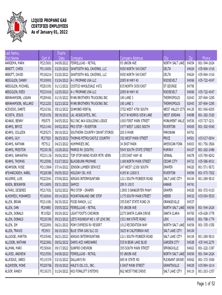 LIQUID PROPANE GAS CERTIFIED EMPLOYEES As of January 01, 2022Last Name, First Lambert #Expire DateCompanyCompany AddressCityZipPhoneAARDEMA, MARK ABBOTT, CHRIS ABBOTT, DAVID ABERDEEN, DANNY ABERDEEN,